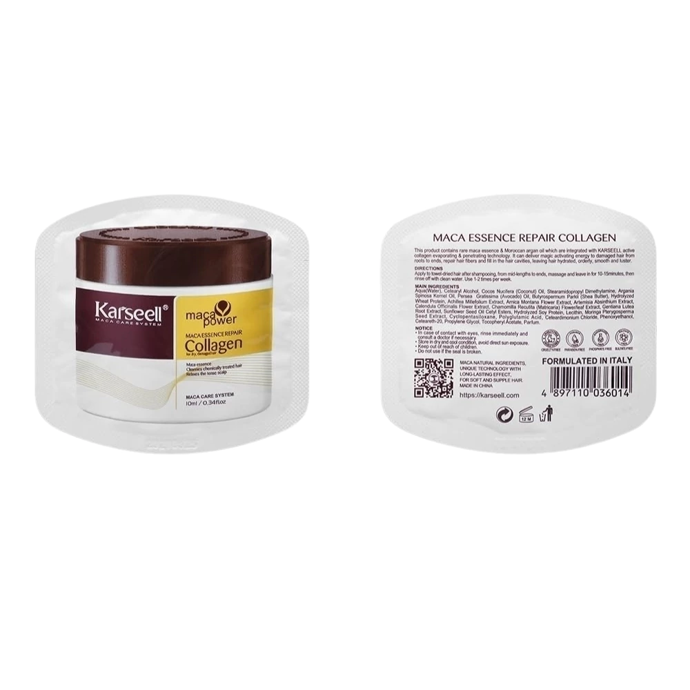 La Karseell Maca Power Collagen en formato sachet de 10ml es una mascarilla capilar reparadora intensiva diseñada para cabellos secos, dañados o tratados químicamente. Este formato es ideal como muestra para probar su efectividad o como tamaño de viaje.